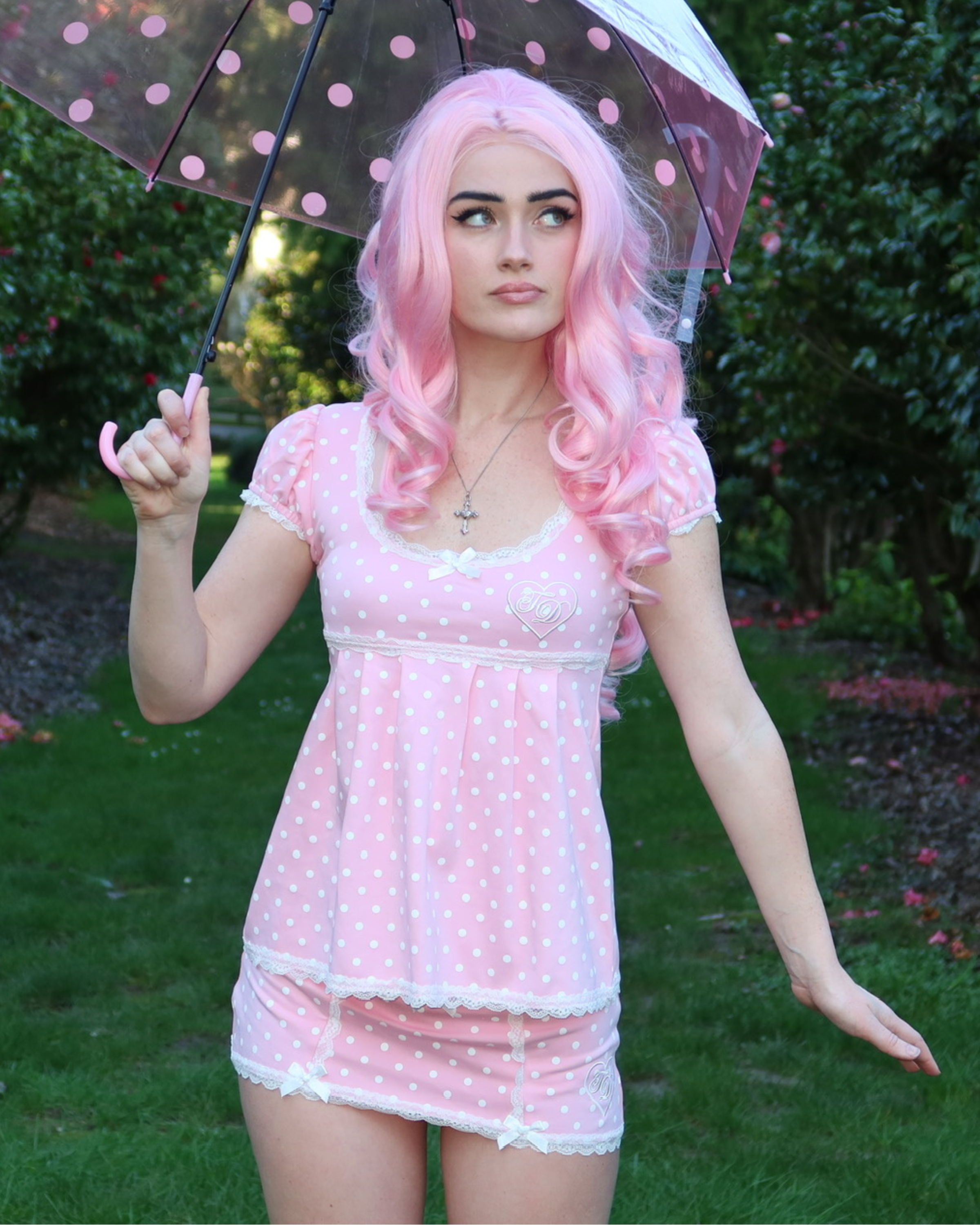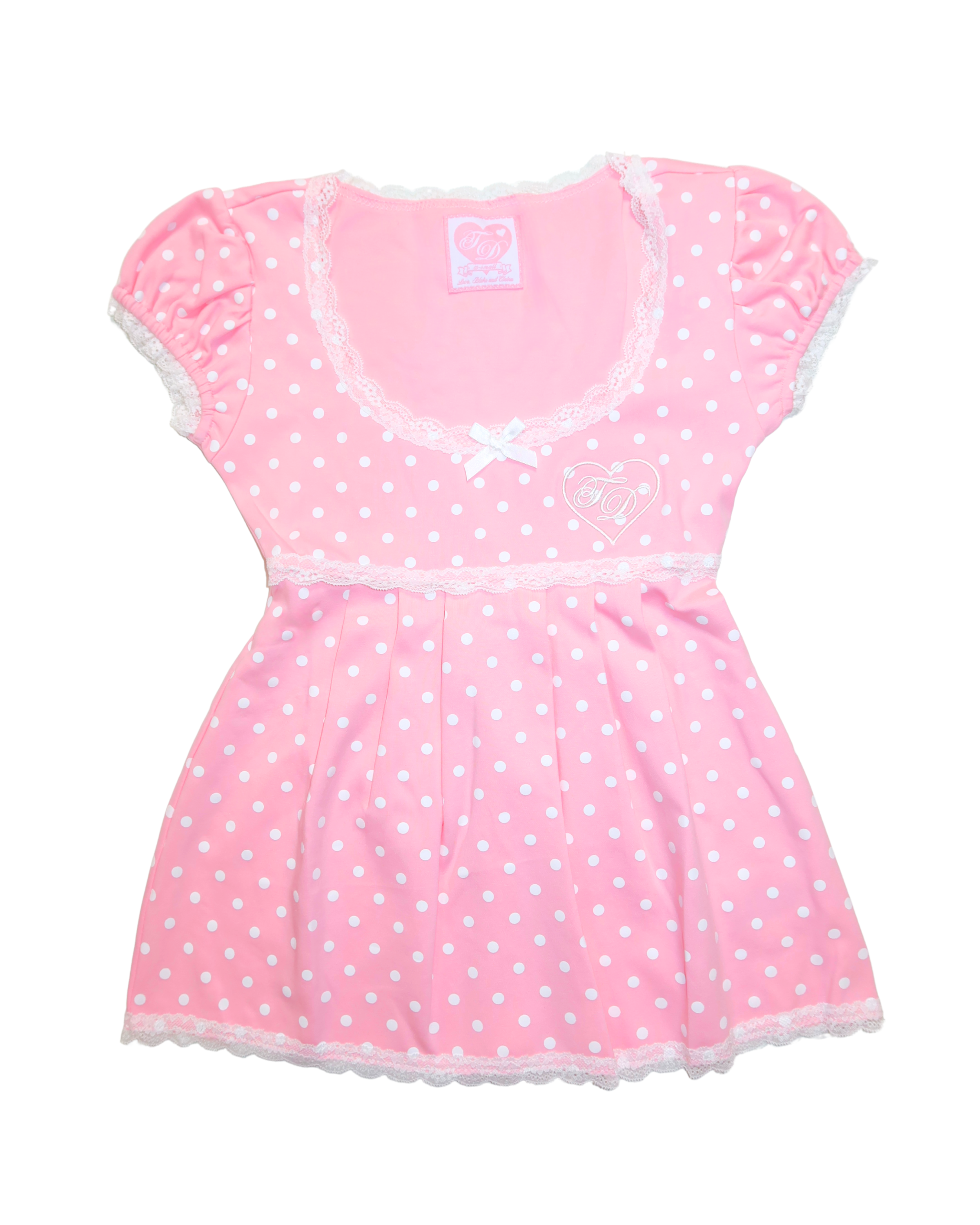 Our scoop neck babydoll top now with puff sleeves in our Strawberries and Cream polka dots! ♡