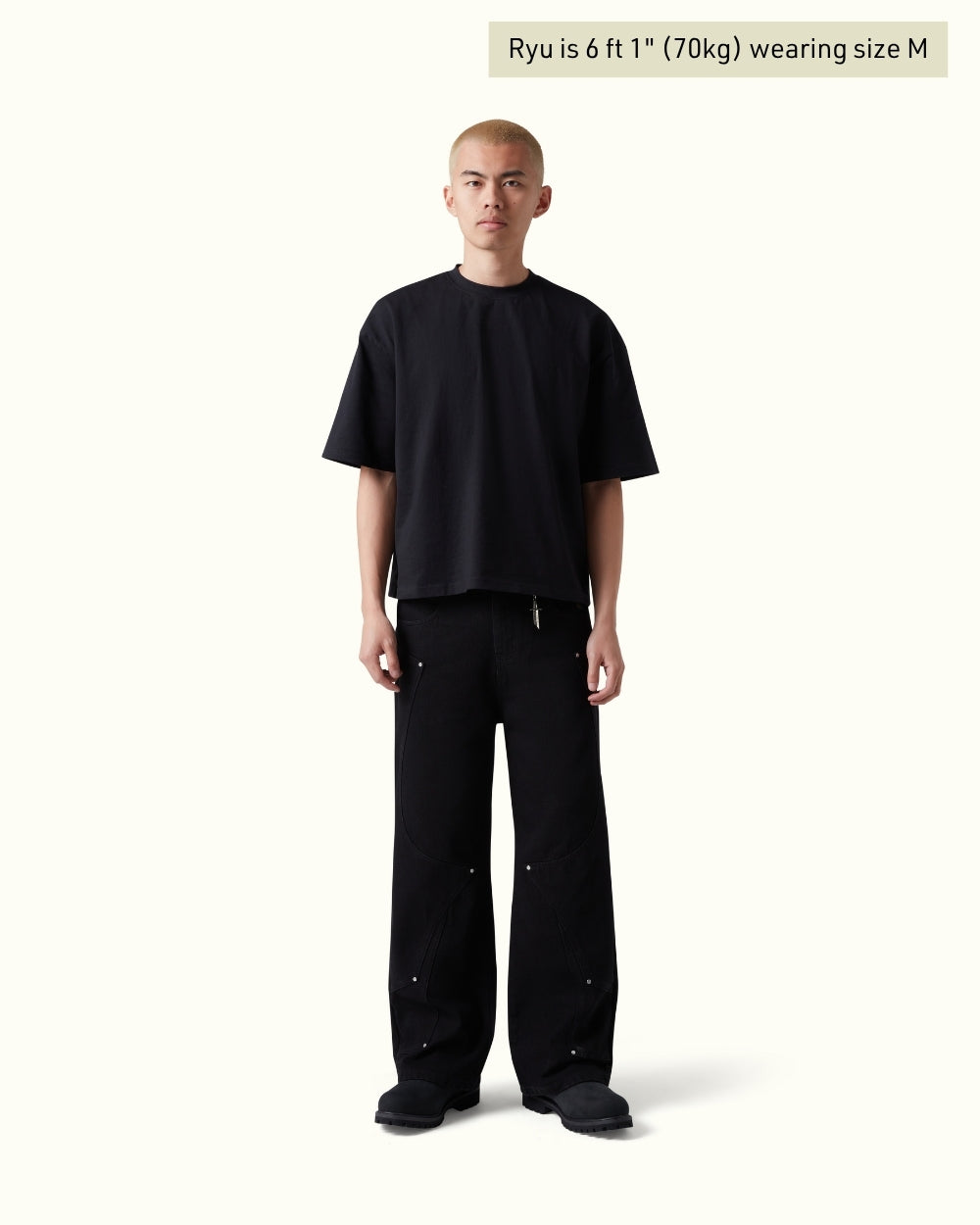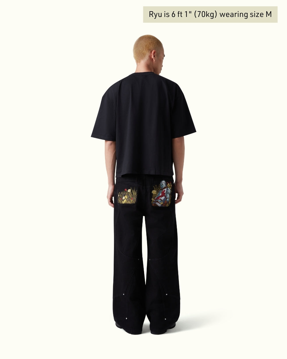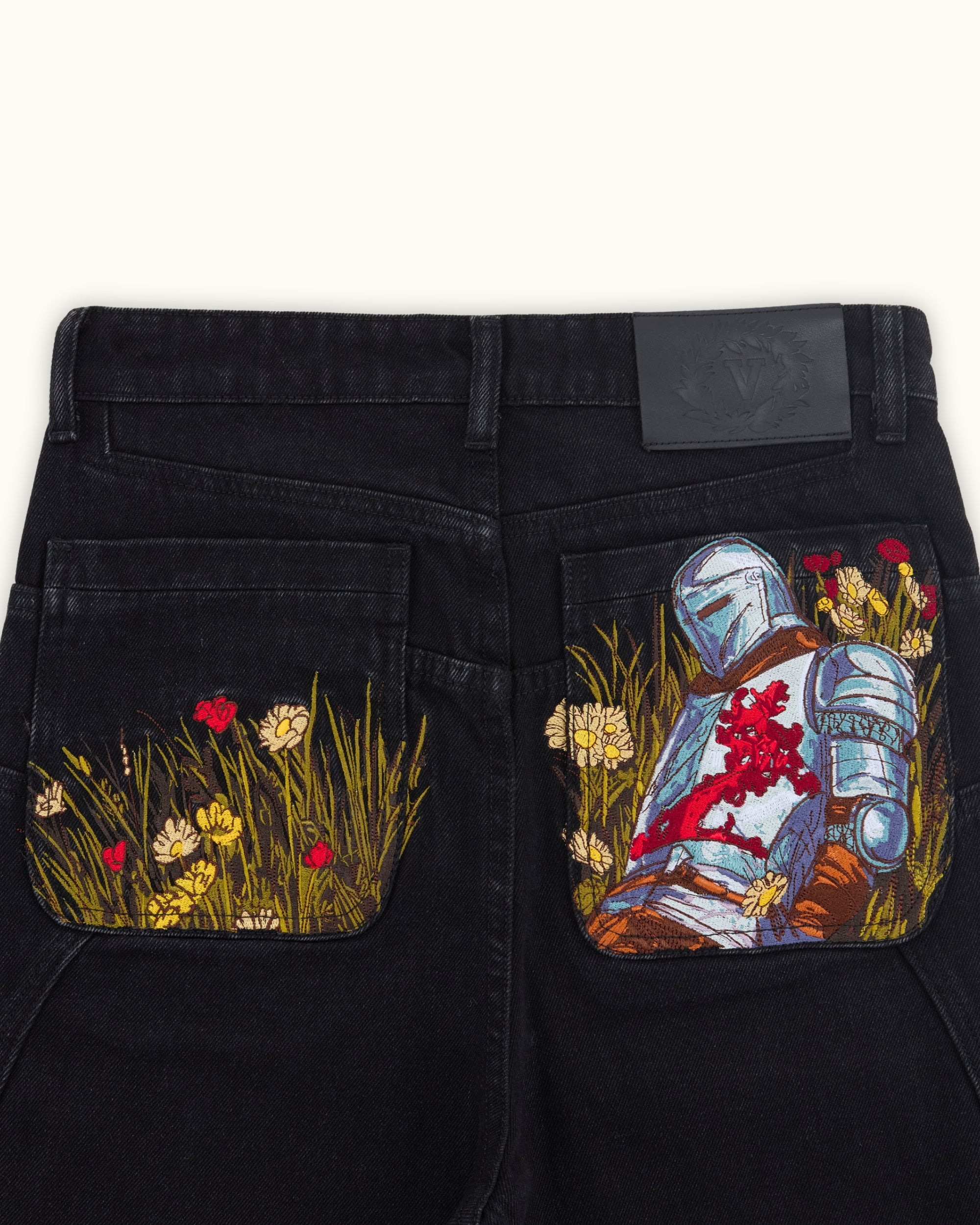 Cut from pure black denim with custom panelling and metal rivet detailing. Back pocket embroidery of a medieval knight resting on a vibrant bed of flowers, with contrasting silver armour and red accents with rich green, yellow, and red blooms. Finished with a debossed leather tab and engraved sword carabiner.