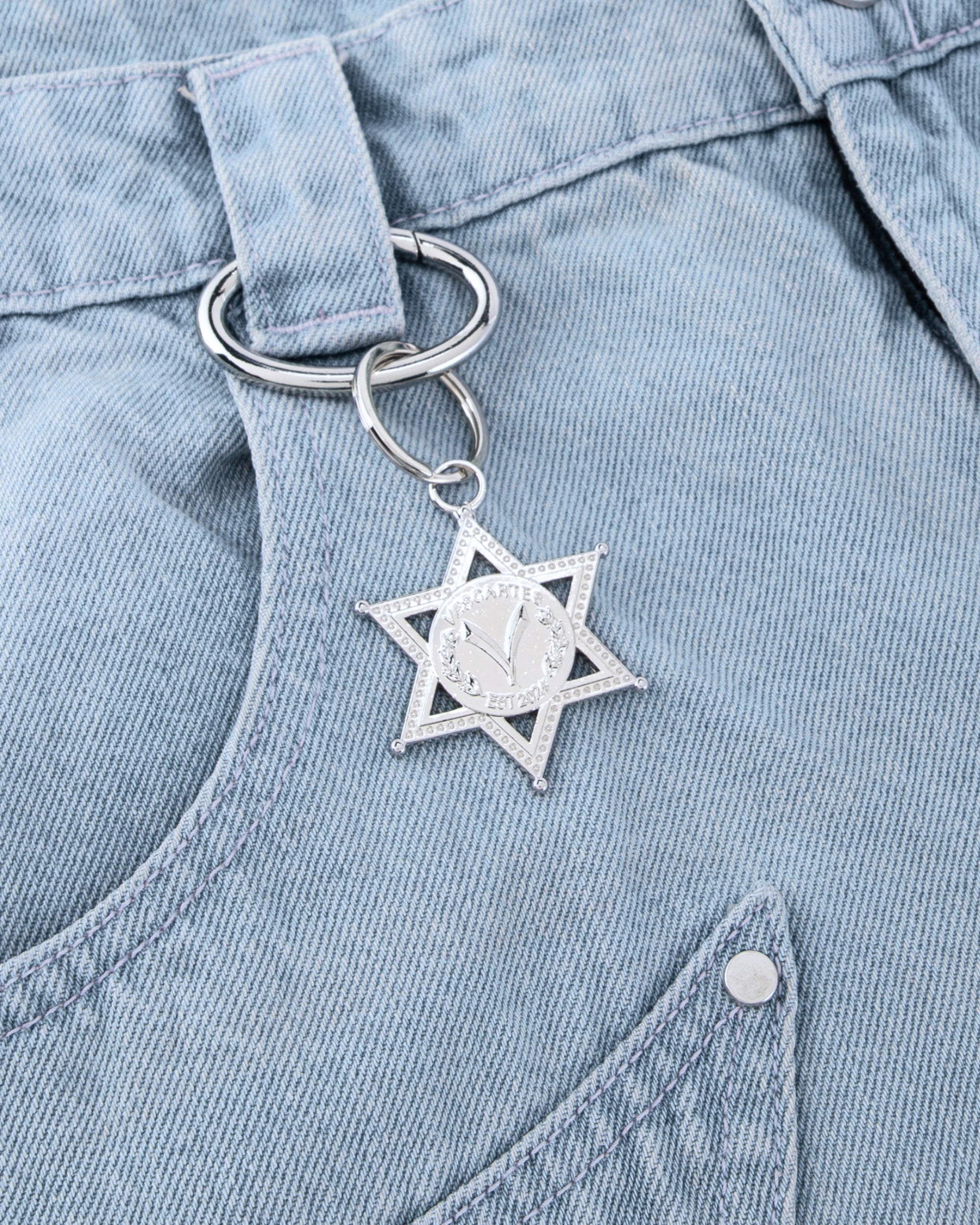 Fast Draw Denim combines light blue acid-washed fabric with beige–toned embroidery, bringing to life a classic cowboy duel in over 200,000 stitches. Finished with custom curved panelling, a leather “Cowboy Shot” tab, and a metal sheriff badge carabiner.
