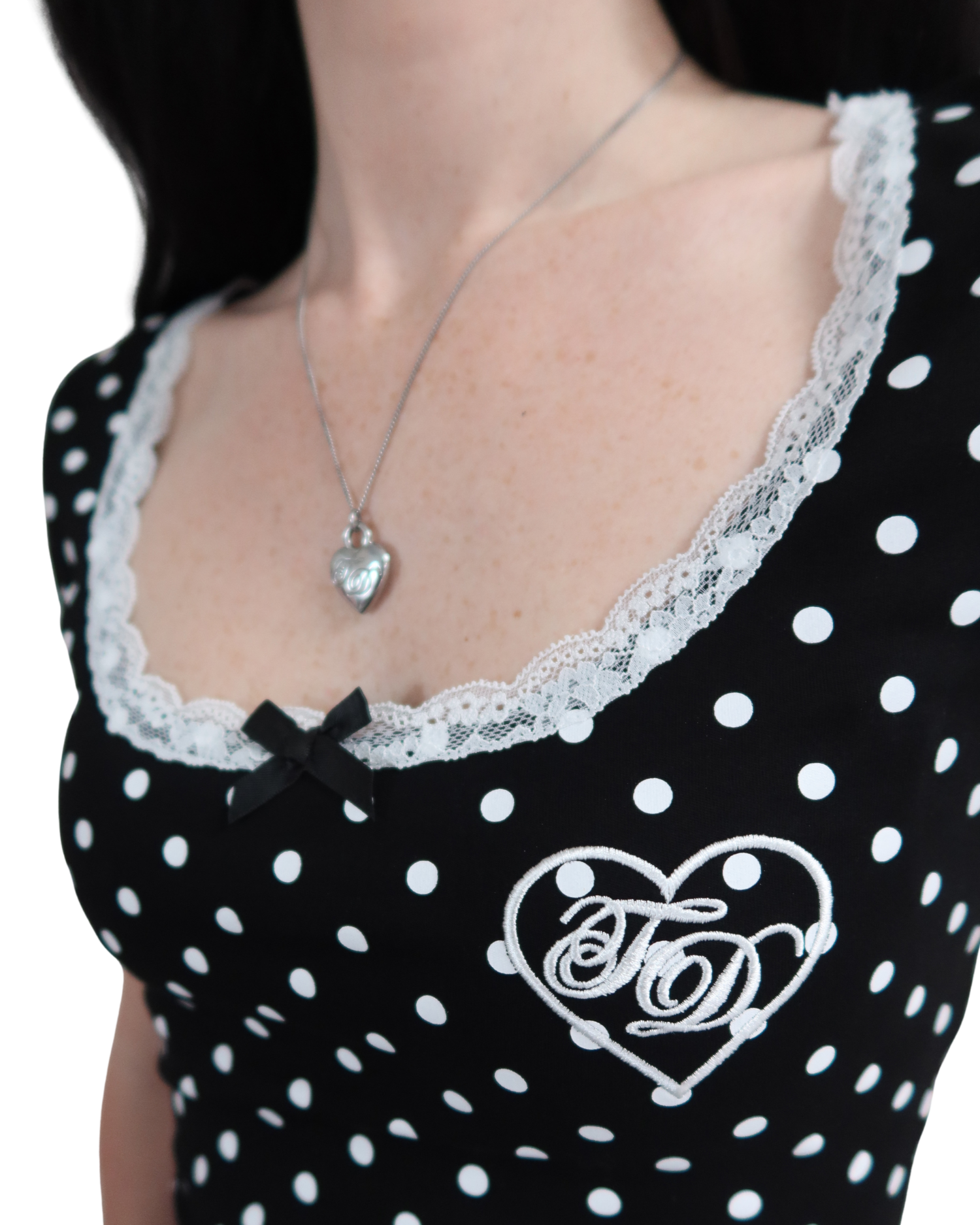 NEW Frenchie Blair Top features our flattering perfect fit with a scoop neck, short sleeves, lace detailing, and an all-over white polka dot print.