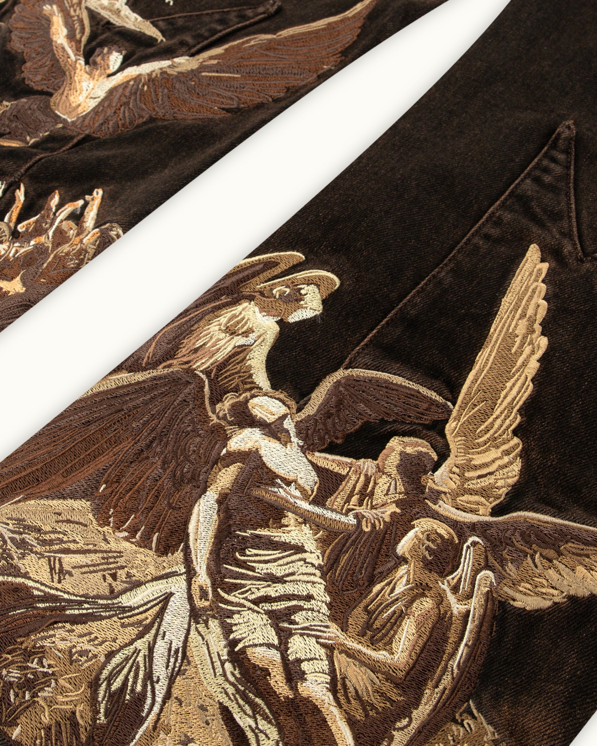 Cut in a deep brown denim with a soft thigh fade. Across the back legs, features a brown-toned 1,000,000+ stitch embroidery, inspired by The Lament of Icarus painting. Finished with custom panelling and a debossed leather tab featuring a golden-ratio 'Vescartes' logo.