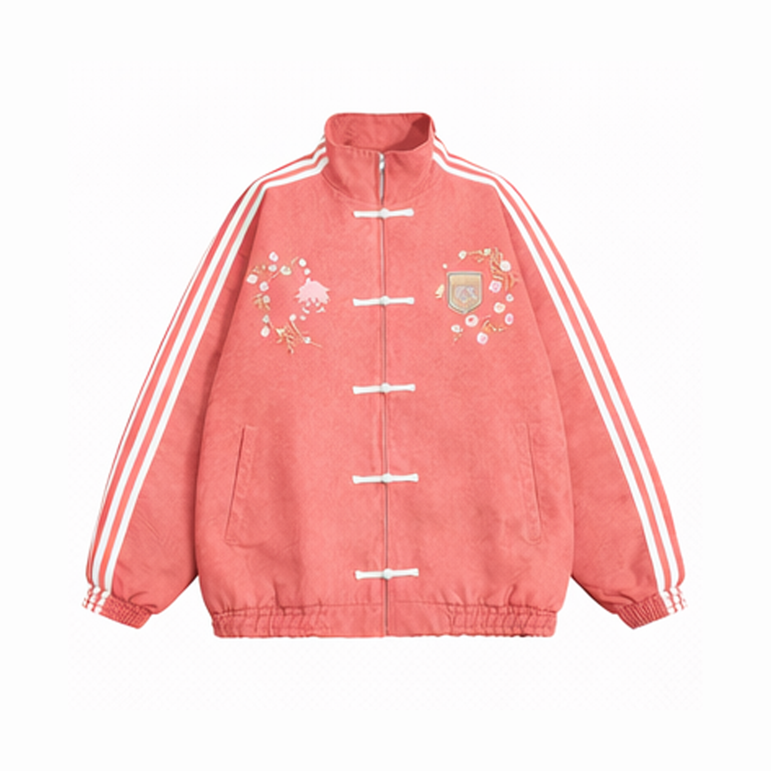Featuring delicate floral embroidery, classic frog closures, and sporty sleeve stripes, this jacket creates a soft yet bold statement.