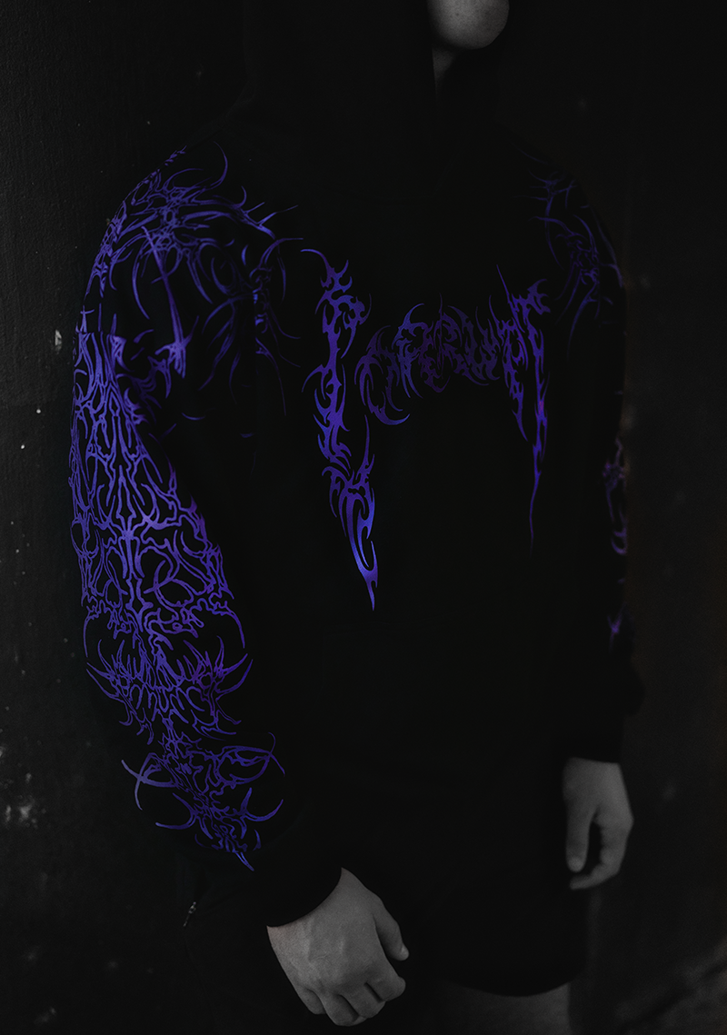 This oversized hoodie features a screen print design on the front, sleeve, and back, crafted from 380GSM French terry cotton for durability and comfort. It includes a kangaroo pocket and offers a relaxed, oversized fit for a contemporary look.