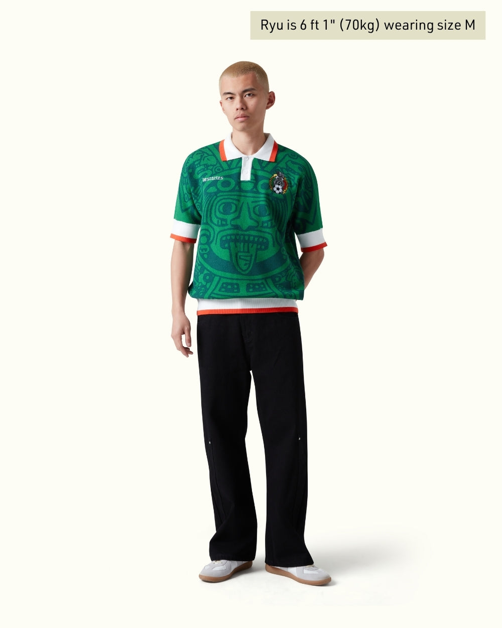 Crafted in a rich emerald green knit, this piece channels the soul of Mexico’s heritage. The jersey features an all-over jacquard Aztec calendar motif — a nod to the 1998 Mexico kit. Finished with contrast red and white accents, and embroidered Vescartes branded chest logos.