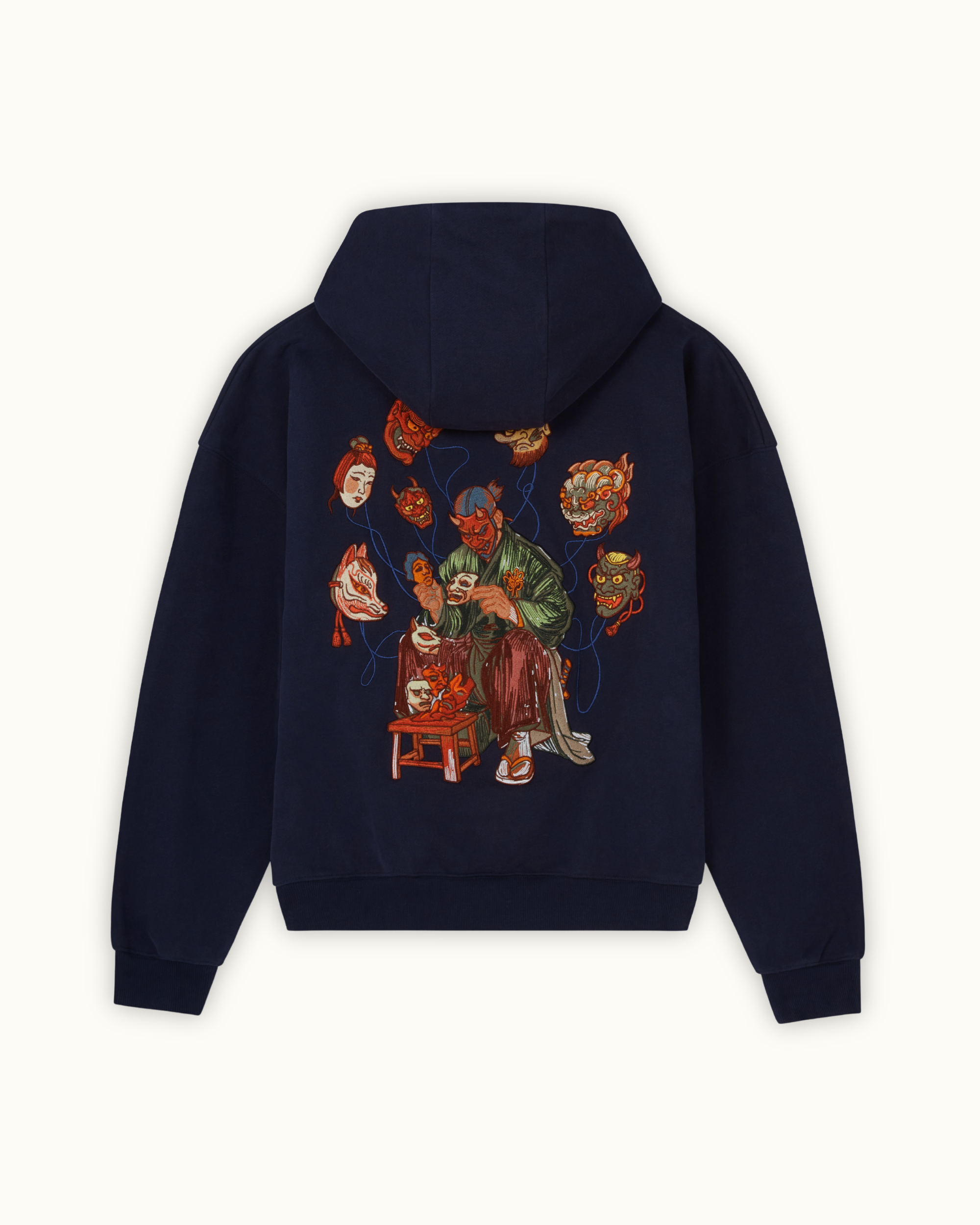 Features a minimal front crest with an expansive embroidered composition across the back. The scene captures a mask maker mid-process, encircled by floating forms that suggest movement and tension. A deep navy base allows the red-led palette to stand forward.