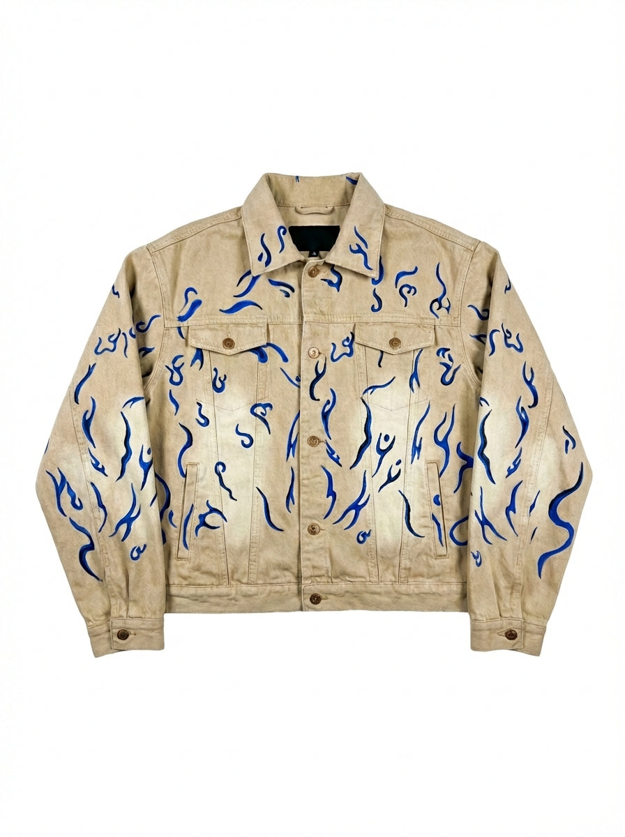 Beige washed denim jacket and pants featuring blue embroidered designs across the entire set for bold contrast and texture. Finished with custom golden buttons that elevate the piece with a premium touch. A statement denim set blending vintage wash with detailed embroidery.
