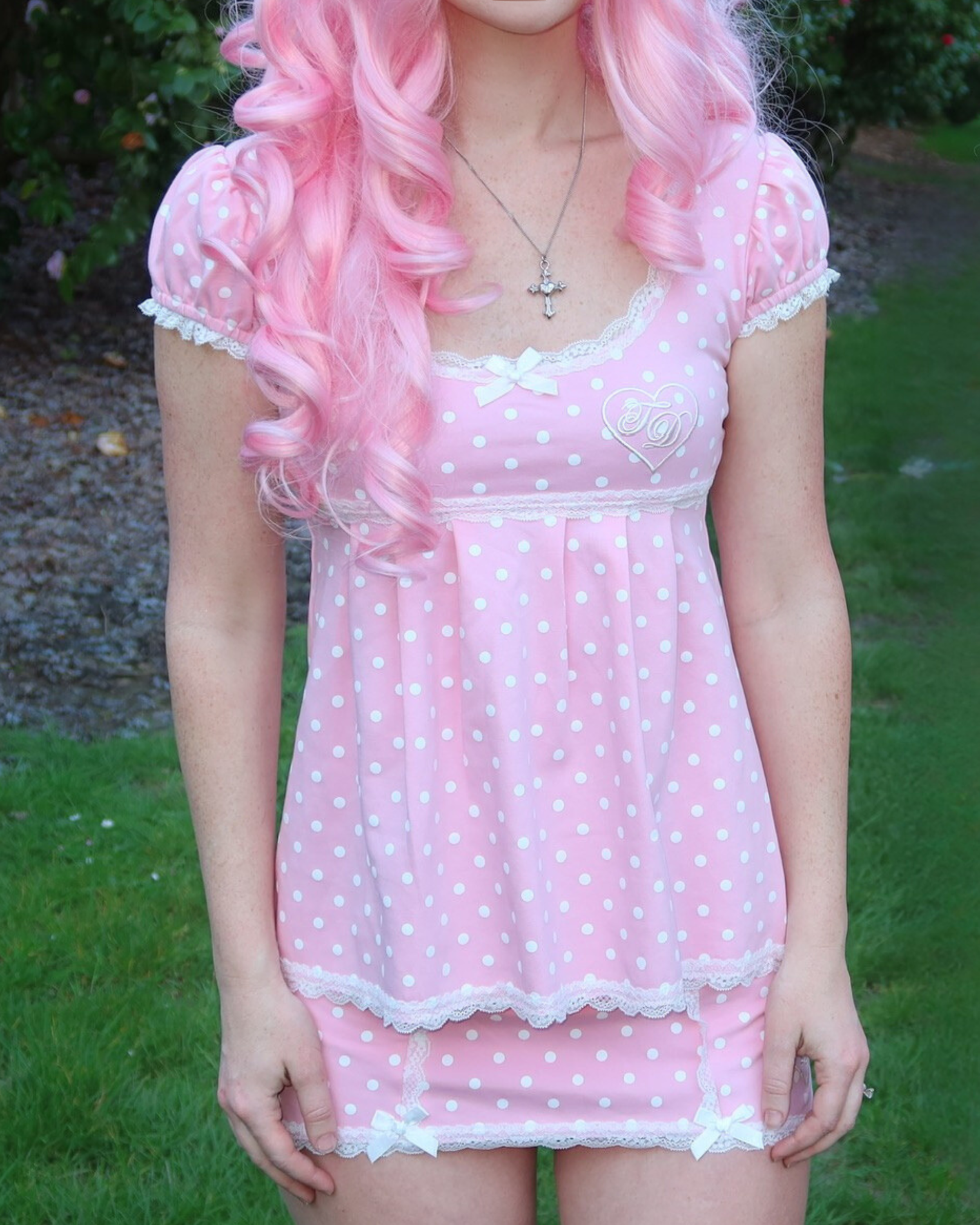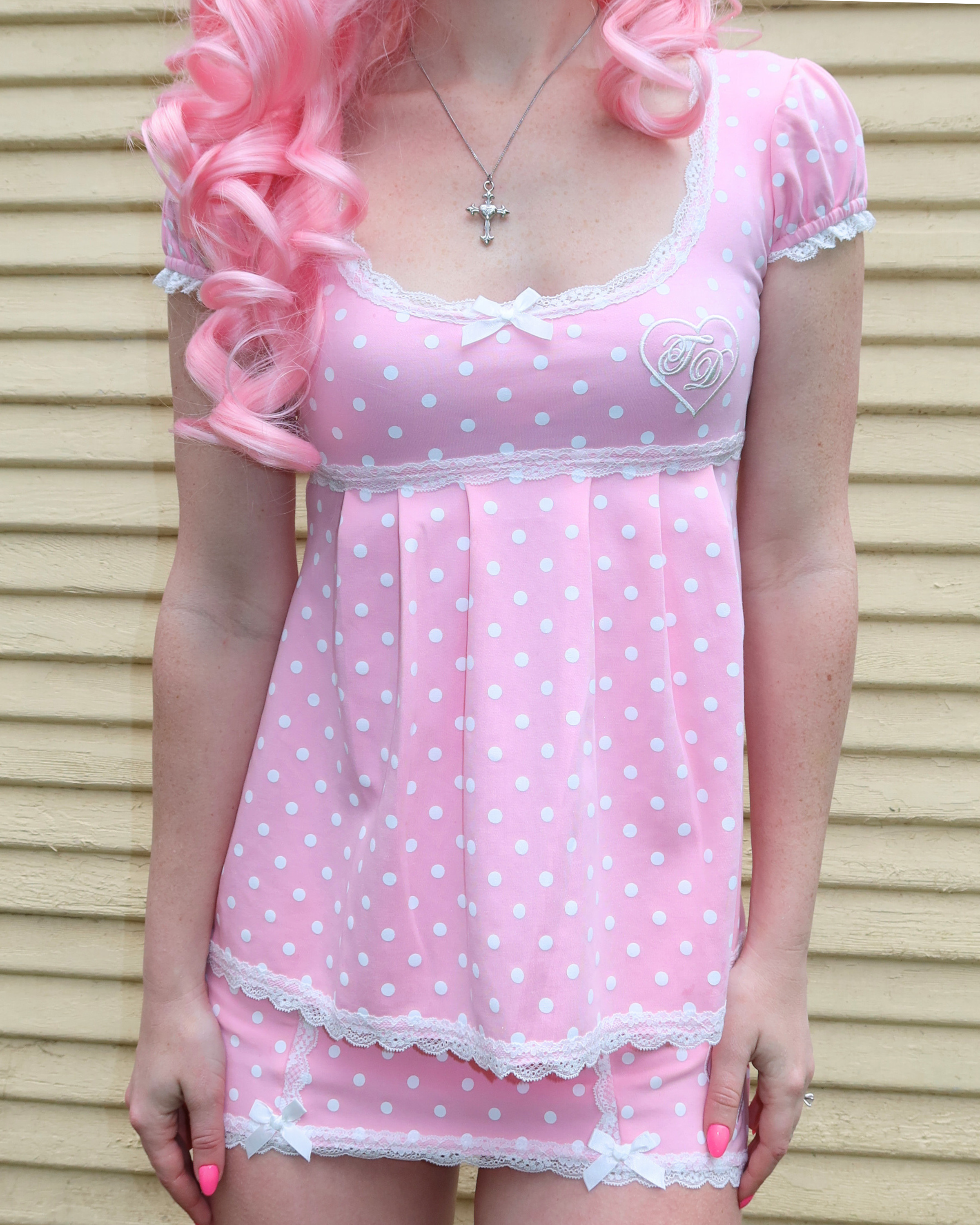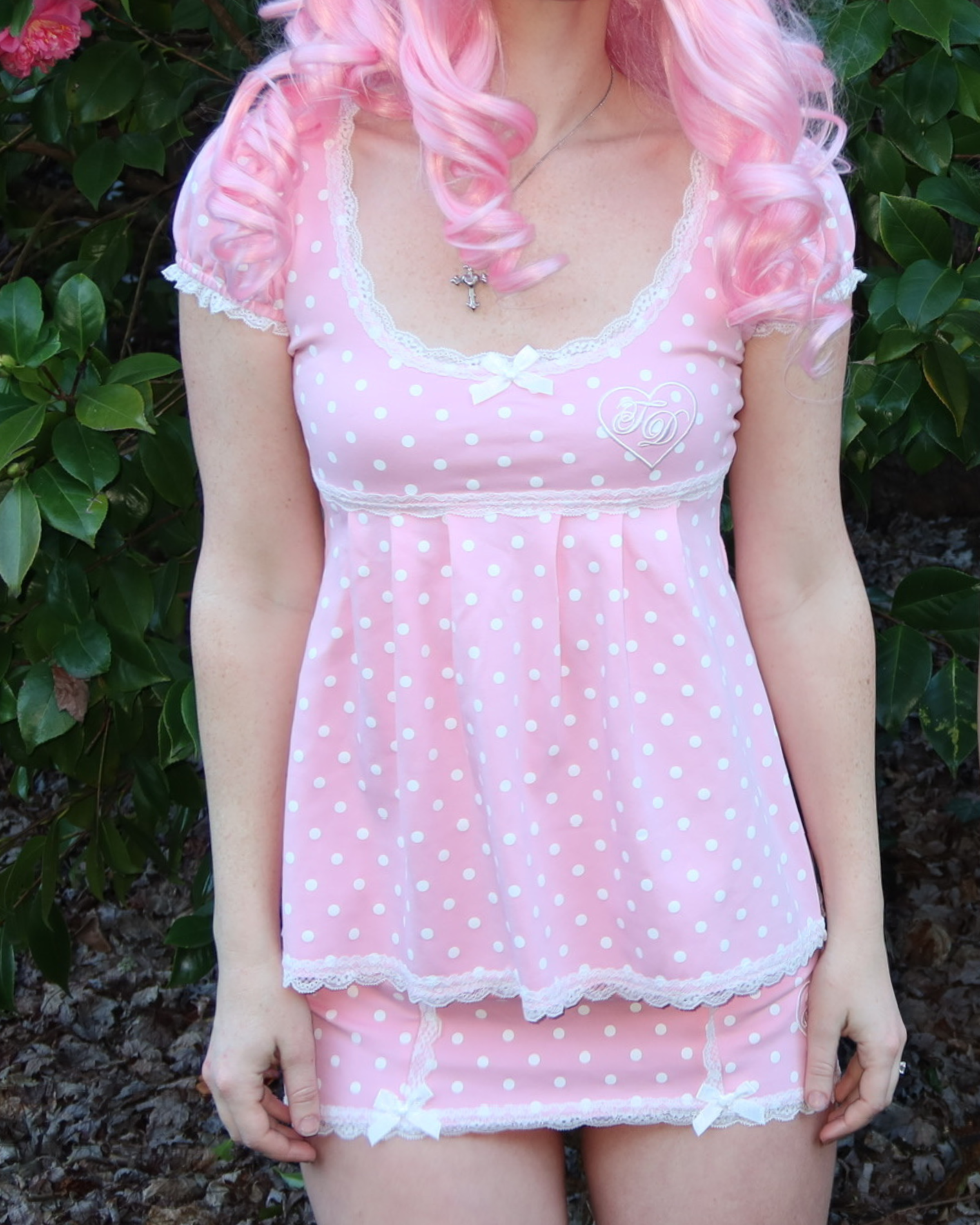 Get the set and save! Our scoop neck babydoll top now with puff sleeves in our Strawberries and Cream polka dot + the cutest matching micro skort ♡