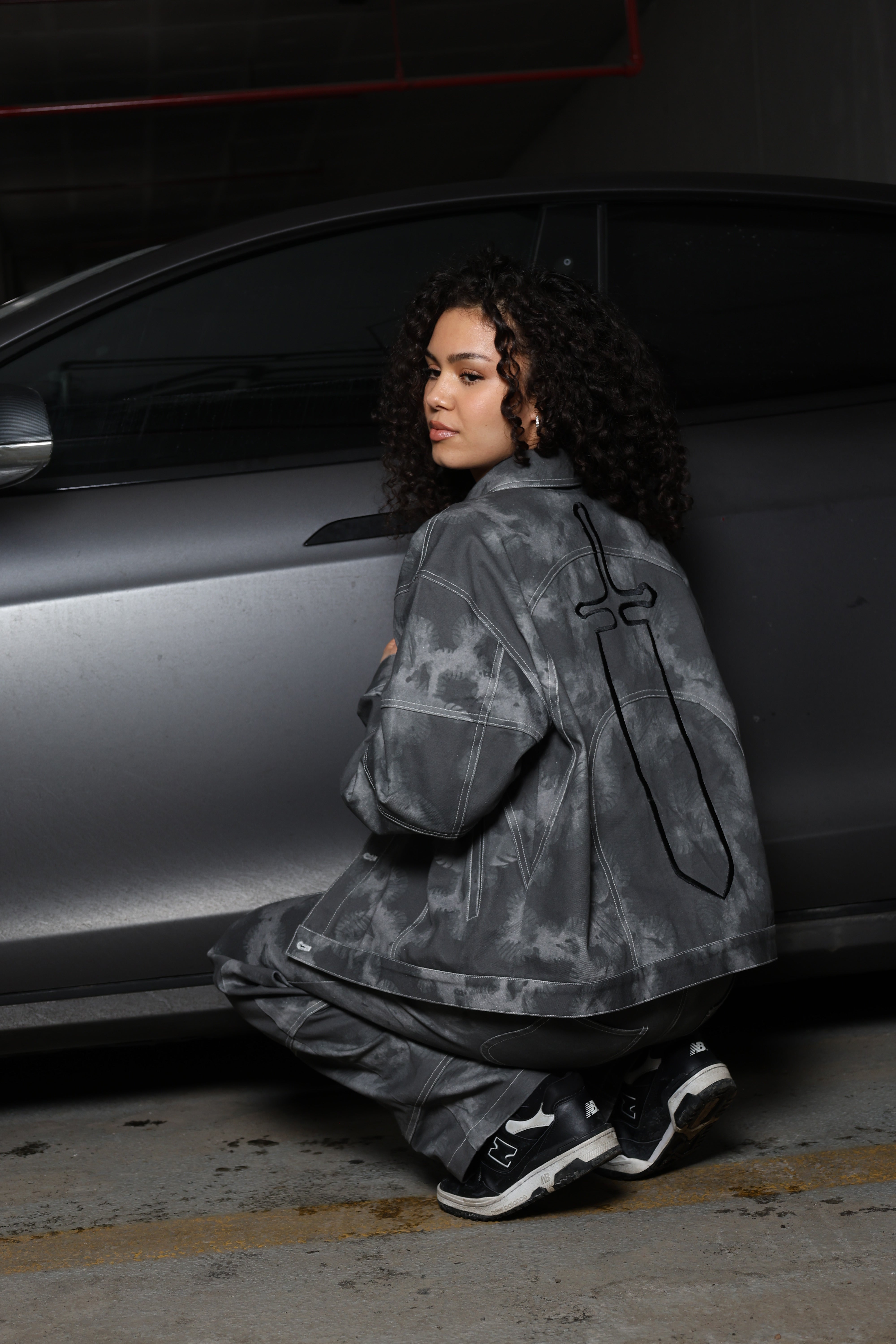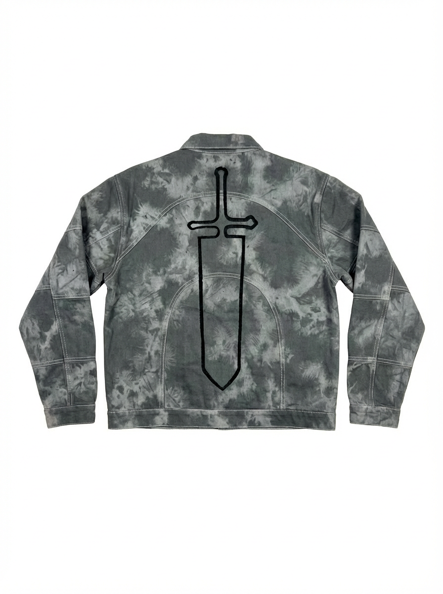 Jacket and pants featuring a fully embroidered sword graphic with screen printed designs across the set. Finished with chrome buttons, custom stitching patterns, and matching construction.