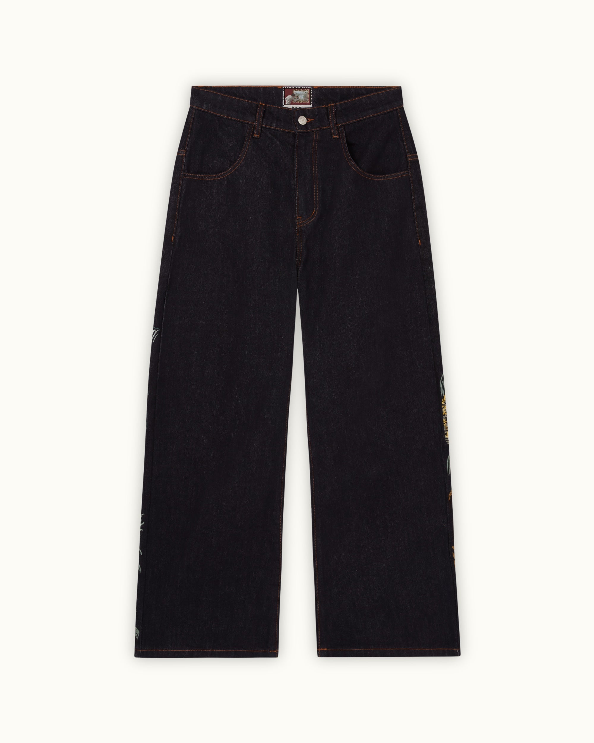 The Tsuru Denim combines a structured silhouette with intricate embroidery across both legs. The artwork unfolds as a continuous landscape, featuring cranes in motion, flowing terrain, and layered natural elements. Built with over 1,000,000 stitches, the composition balances detail with negative space.
